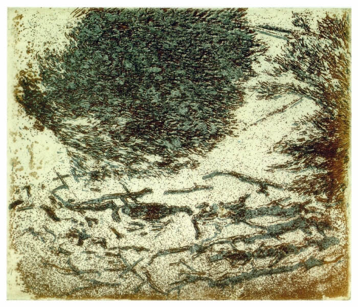 "Weidenbusch und Schwemmholz", Farbradierung
